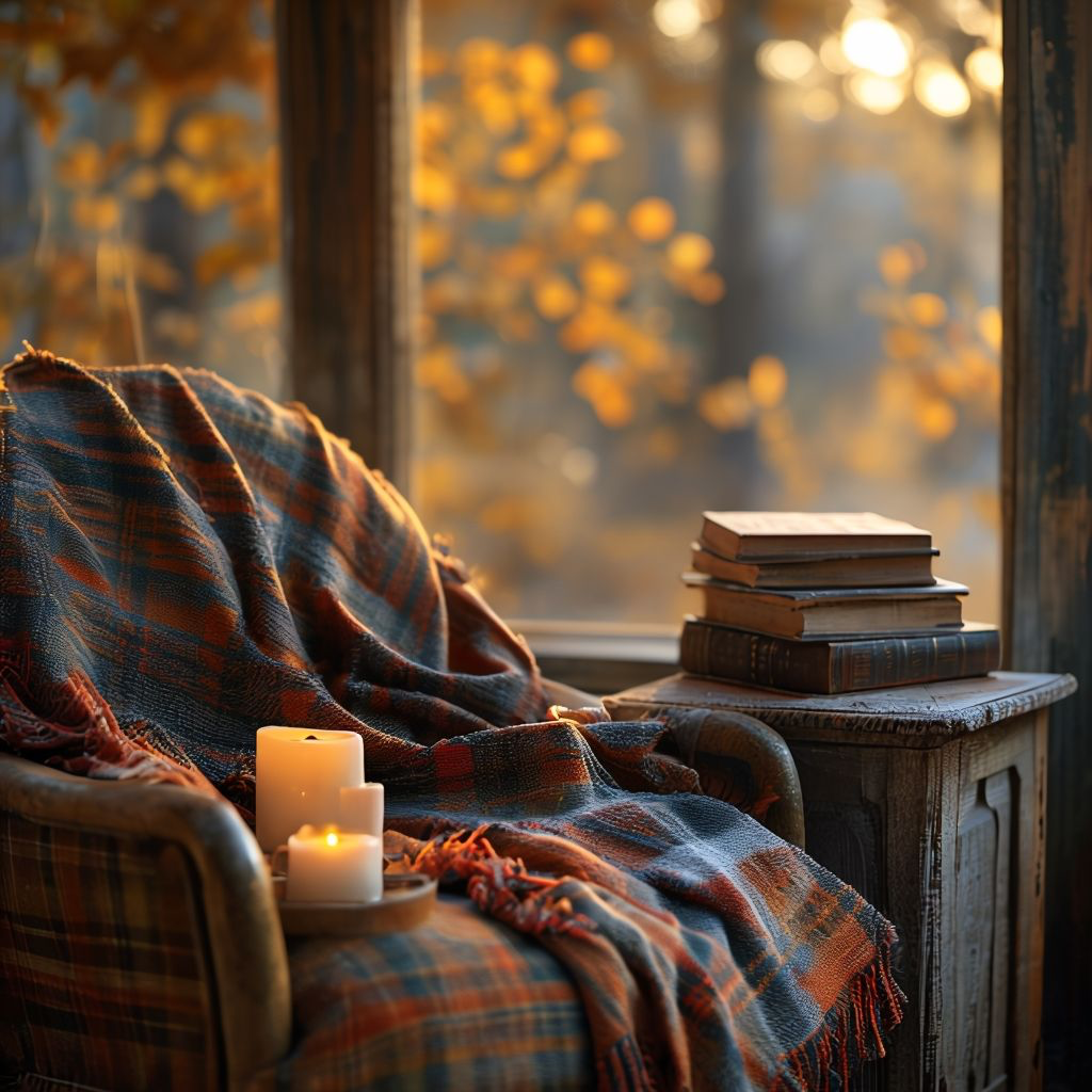 - Armchair or upholstered chair with a warm throw