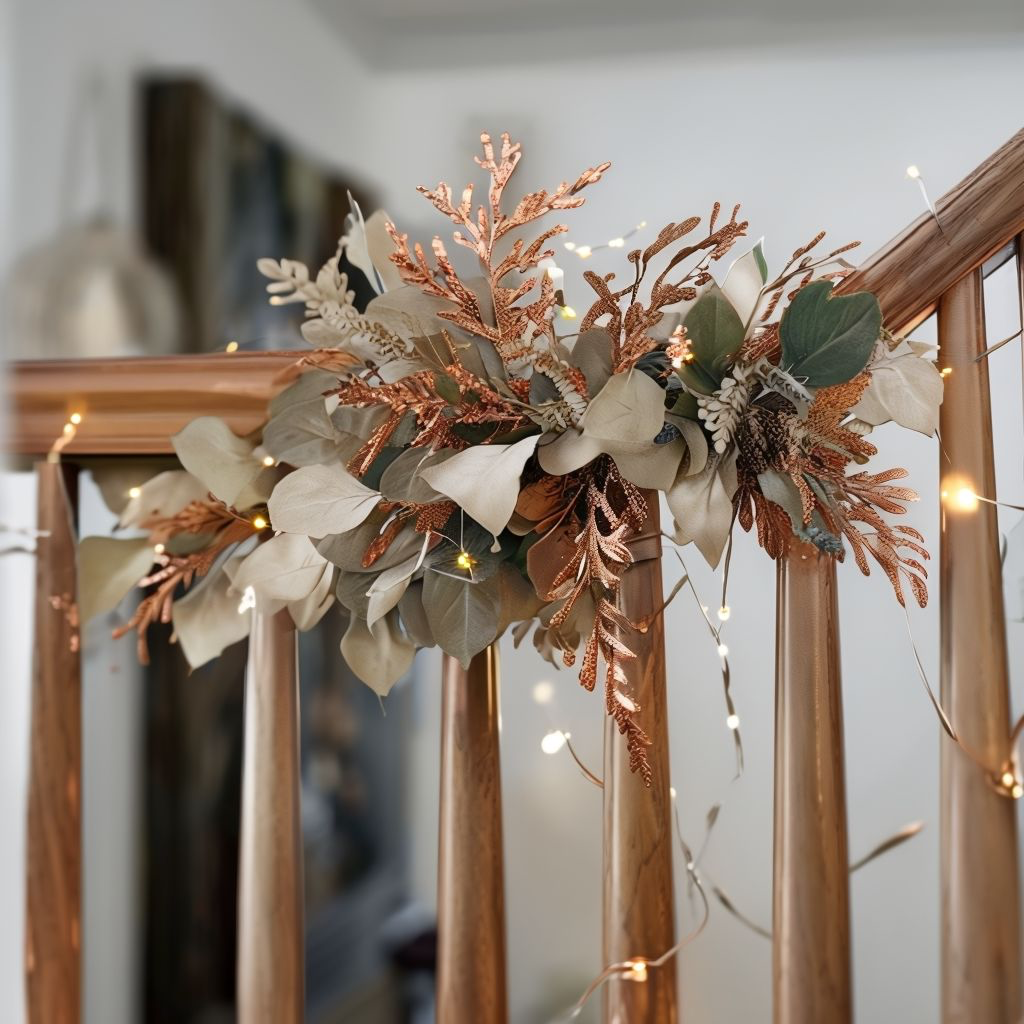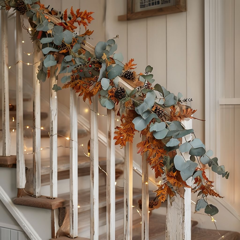 • Drape a garland of faux leaves, eucalyptus, or wheat along the banister.