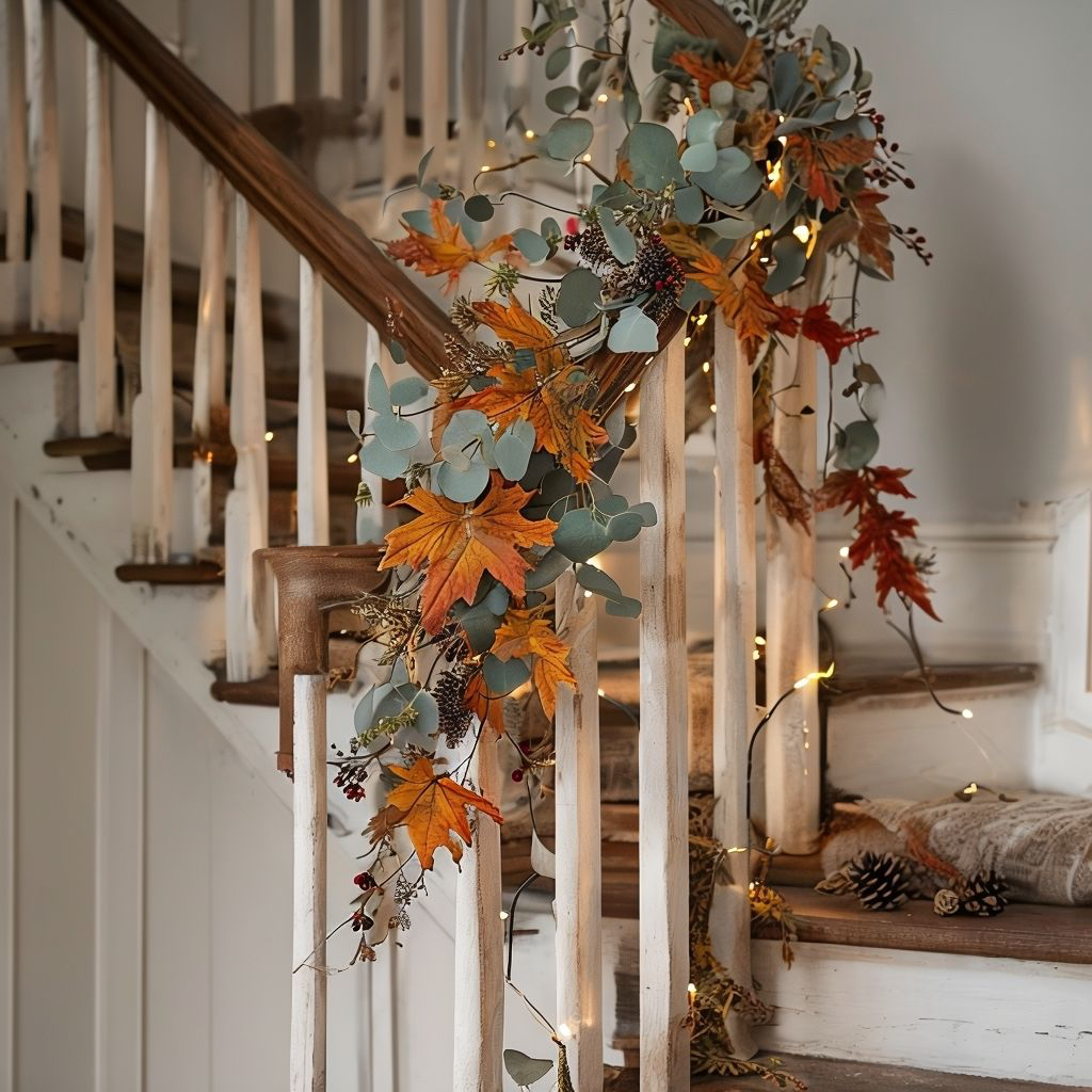 Garlands are one of the easiest and most effective ways to decorate a stairwell for autumn.