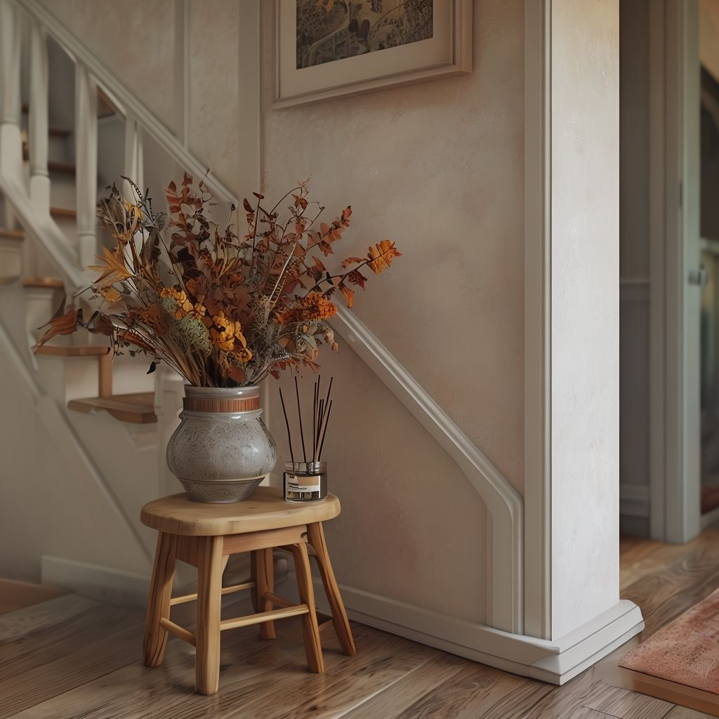 • A small side table or stool with a vase of dried flowers or autumn foliage.
