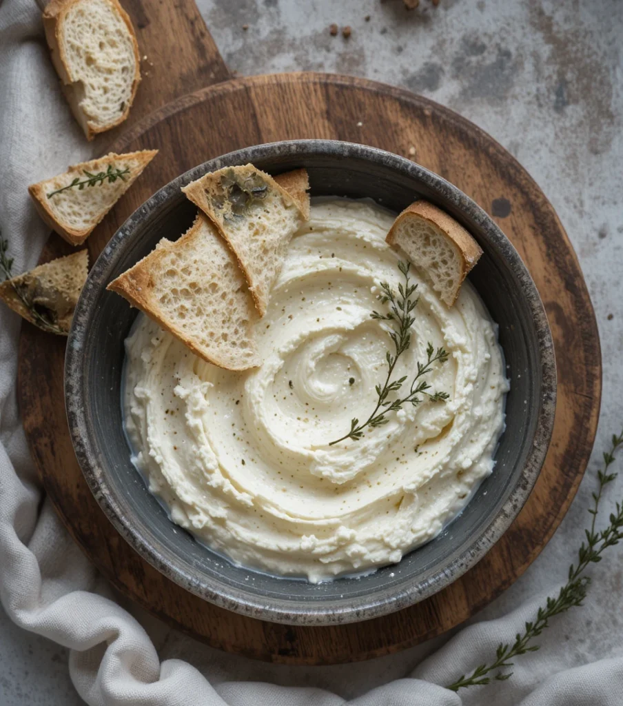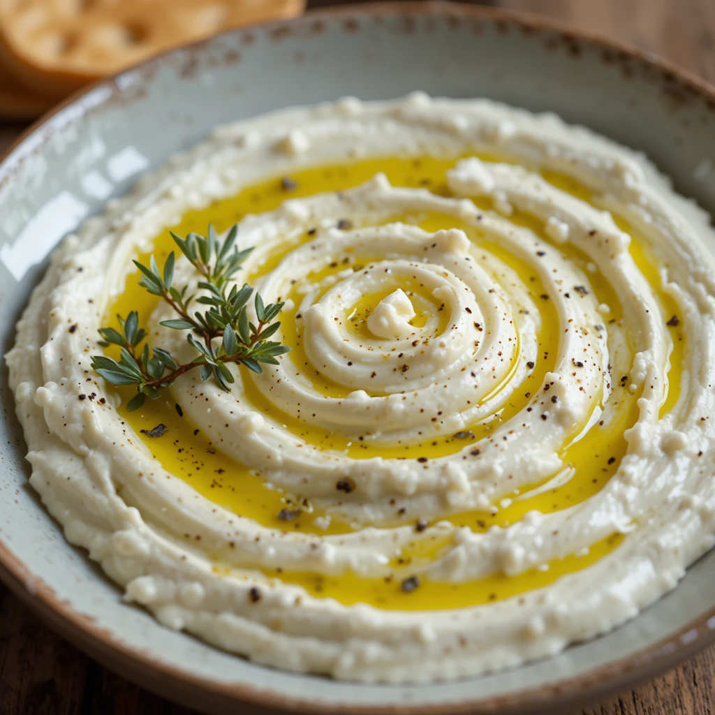 Salty feta whipped until light and creamy, softened with yoghurt and olive oil, then finished with fragrant thyme… it’s a dip that feels rustic yet refined. Ideal for grazing boards, cosy evenings with friends, or slow weekends when you want something savoury without fuss.
