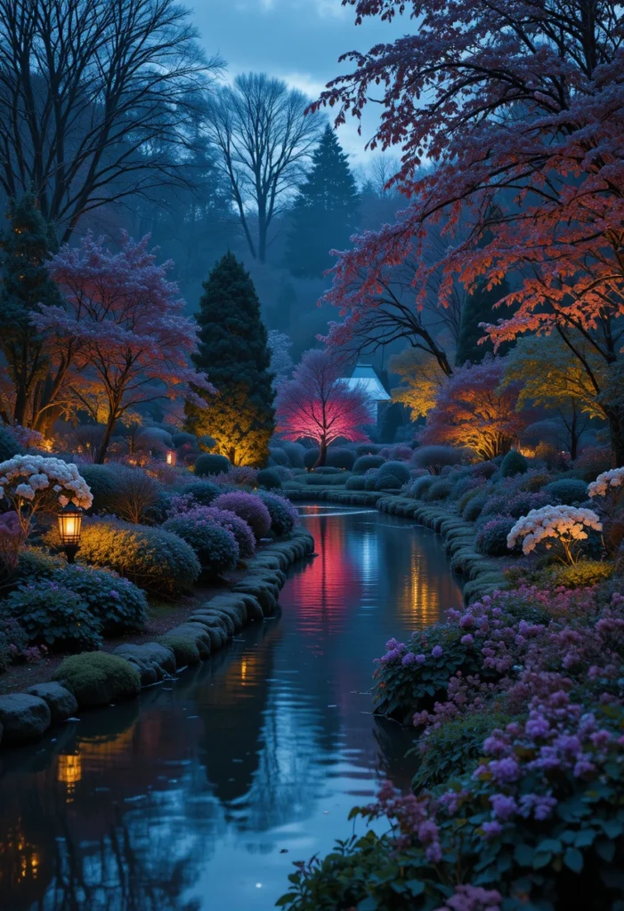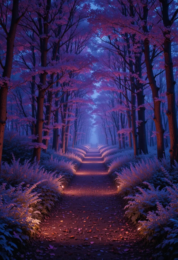 The Bedgebury Pinetum creates a magical forest feel, with tall trees lit in jewel tones and paths winding through misty, glowing woodland.