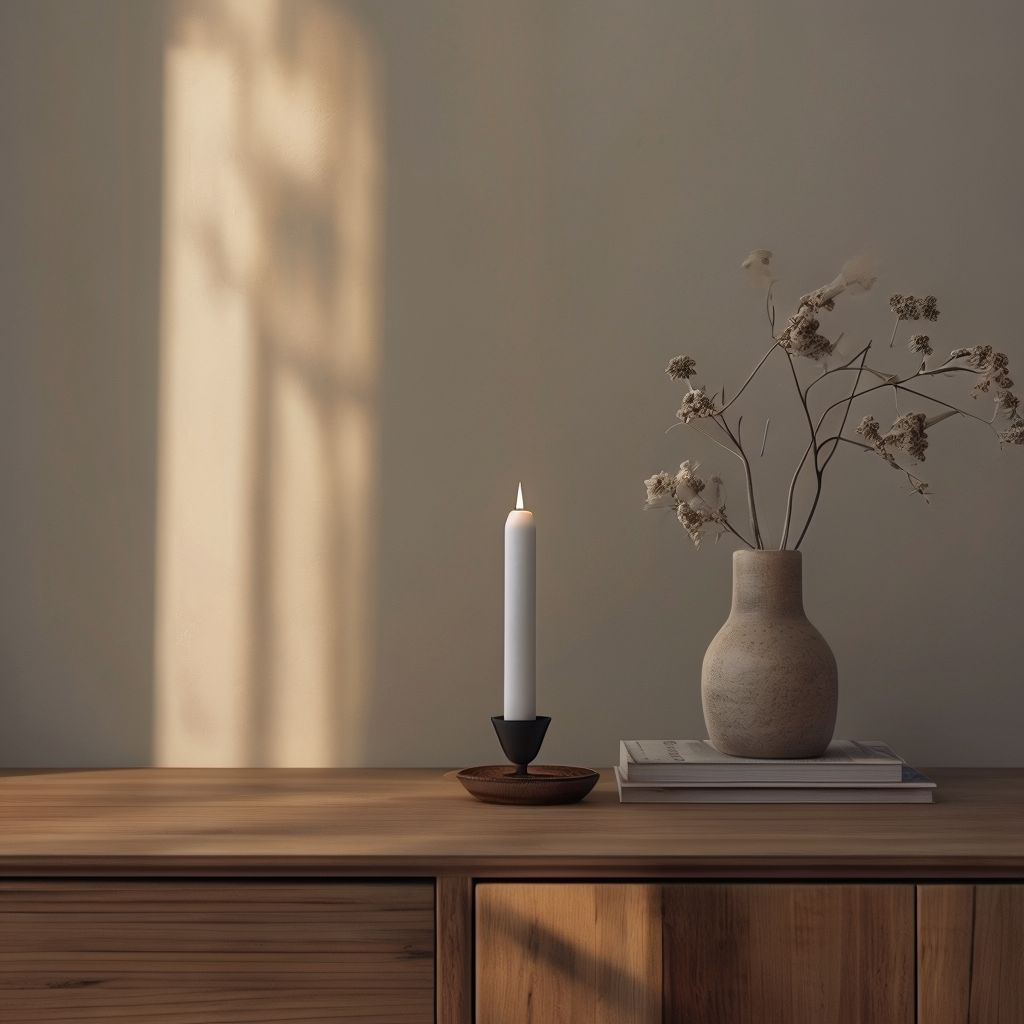 Choose a few purposeful pieces – a candle, a book stack, a small bowl – and let the rest breathe.